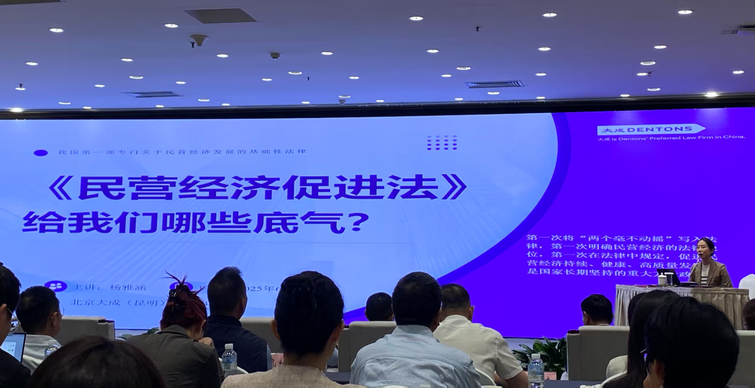 北京大成(昆明)律师事务所专职律师、合伙人杨雅涵解读《民营经济促进法》从立法背景、立法原则、民营经济促进法制度措施、法规条例以及即将实施的亮点几方面详细讲解。