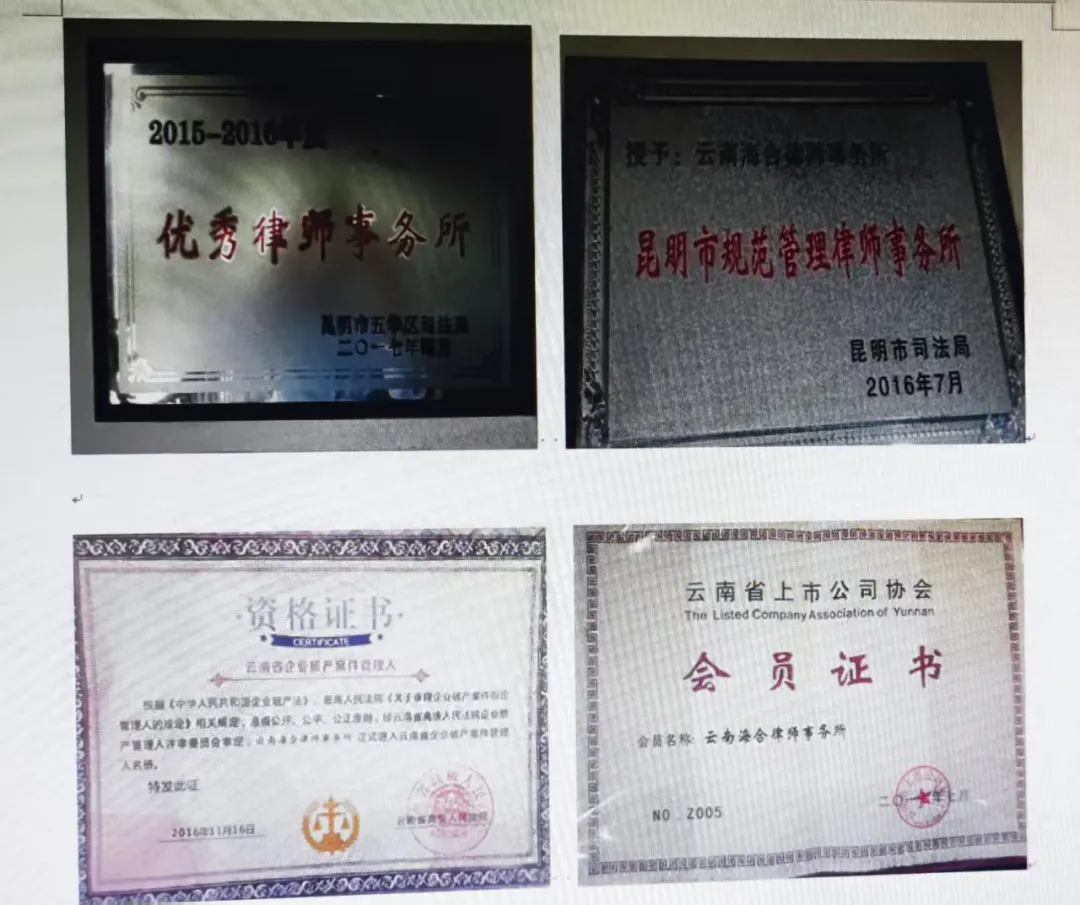 (四)本所获得的荣誉(部分)■ 2017年荣获五华区司法局“优秀律师事务所”称号 ■ 2016年获昆明市司法局“规范化管理律师事务所”称号 ■ 2009年荣获云南省司法厅“云南省优秀律师事务所”称号 ■ 2008年荣获云南省司法厅“云南省优秀律师事务所”称号 ■ 2007年荣获云南省司法厅“云南省优秀律师事务所”称号 ■ 2006年荣获云南省司法厅“云南省优秀律师事务所”称号 ■ 2005年荣获云南省司法厅“先进单位”称号 ■ 2004年荣获云南省司法厅、云南省律师协会“先进集体”称号 ■ 2002年荣获云南省司法厅“法律服务行业文明服务窗口”称号