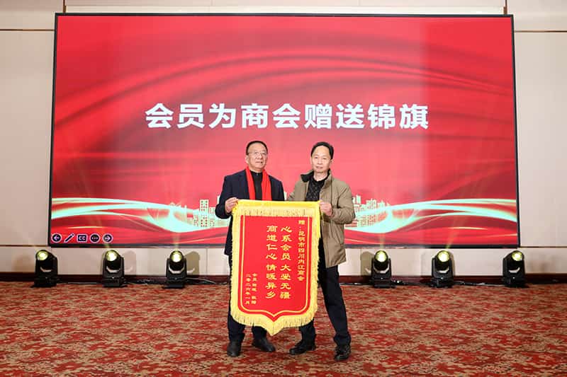 携手相助,大爱无疆。商会会员田斌去年生病住院,商会得知后,组织会员进行捐款救助,现在他康复了,为表达对商会的感谢,特别送上锦旗致谢。他表示,商会不仅是事业发展的平台,更是背井离乡游子们在昆明打拼可信赖、可依靠的“家”。邱礼新会长代表商会接锦旗,现场洋溢着浓浓的亲情与感动。