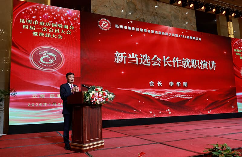 1月26日下午,昆明市重庆铜梁商会第四届一次会员大会暨就职典礼在昆明世纪金源大饭店举行。大会选举产生了新一届商会领导班子,李华刚先生众望所归,连任会长。来自重庆铜梁、云南昆明两地的党政领导、工商联负责人、各界嘉宾、全国友好商协会代表及商会全体会员近500人欢聚一堂,共襄盛举,共同见证这一凝聚乡情、共谋发展的辉煌时刻。