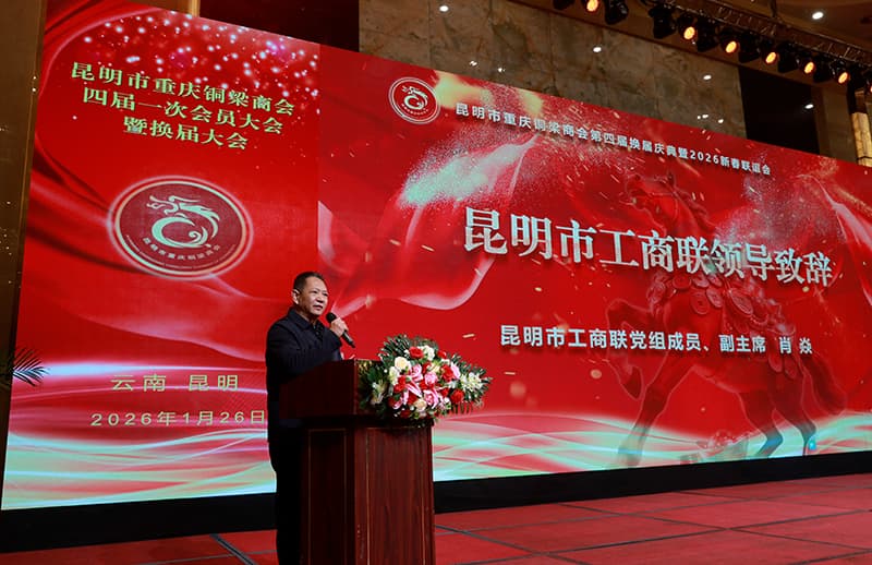 昆明温州总商会会长王国新作为友好商会代表致辞。他盛赞铜梁商帮敢闯敢试、团结奋进的精神,肯定了昆明市重庆铜梁商会在服务会员、促进滇渝交流方面的突出贡献。王国新会长回顾了两家商会间的深厚友谊与合作基础,并展望未来,提出三点共建建议:共筑同心家园,分享治理经验;共抓时代机遇,依托各自产业优势,携手拓展市场;共担社会责任,联合投身公益,擦亮商会品牌。他的致辞体现了异地商会间携手共进、合作共赢的美好愿景。