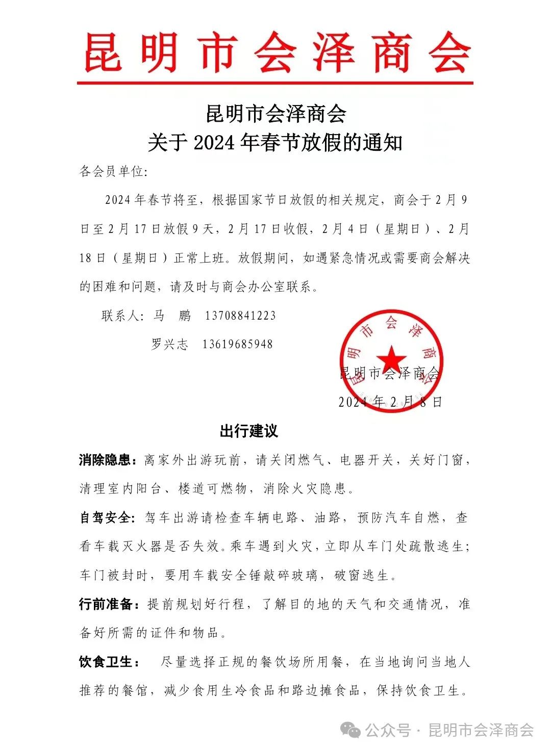 通知公告| 昆明市会泽商会关于2024年春节放假的通知 |