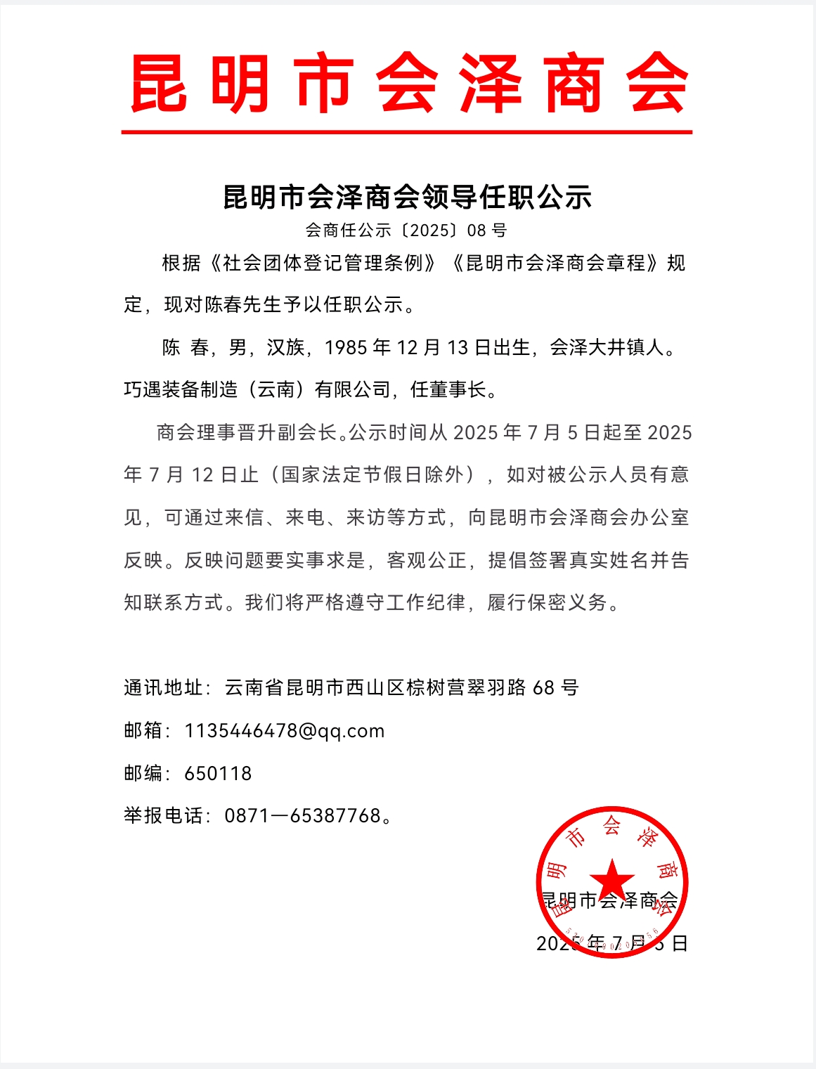 通知公告| 昆明市会泽商会领导任职公示 |