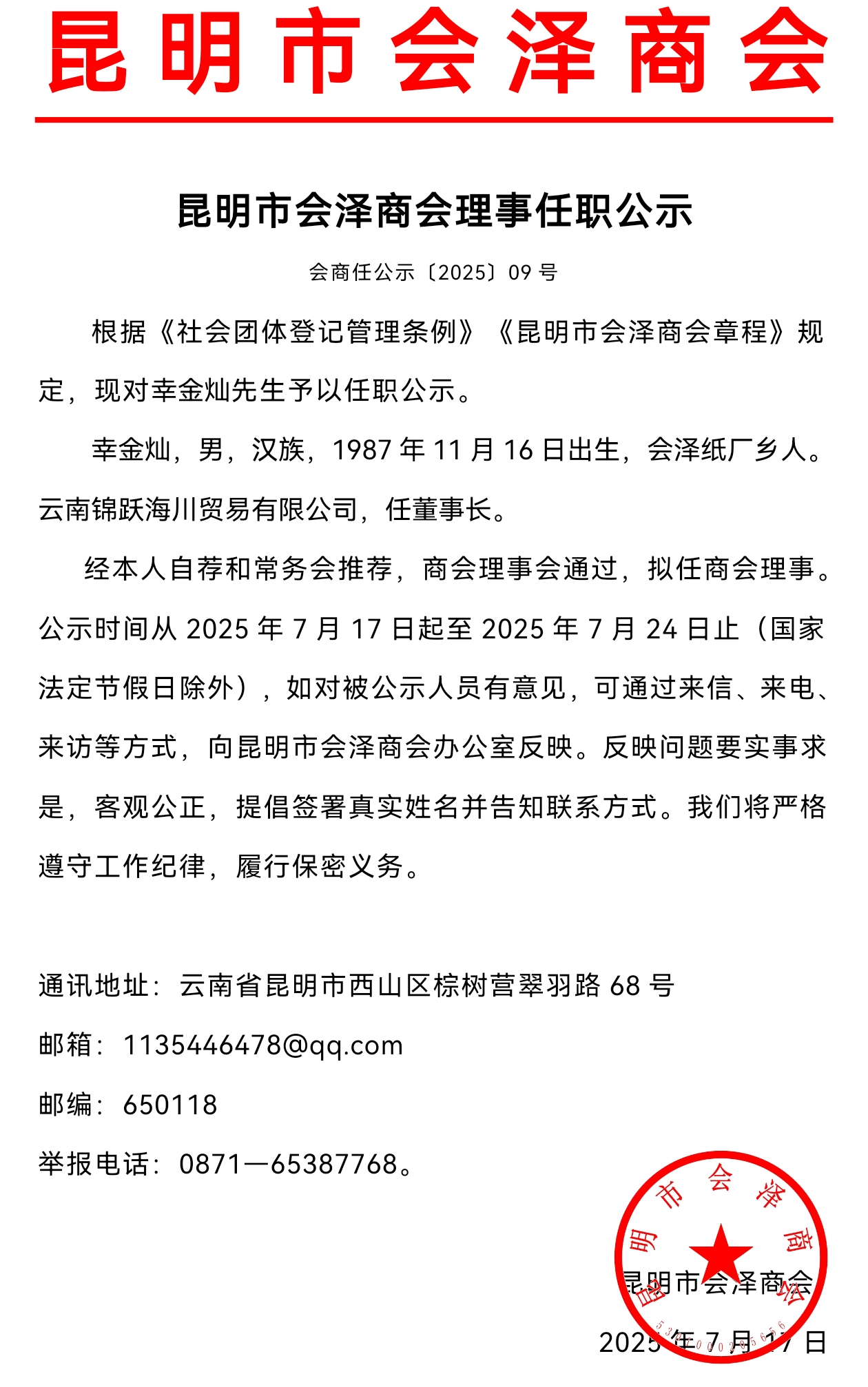 | [下一篇]:【商会公示】昆明市会泽商会理事任职公示 |