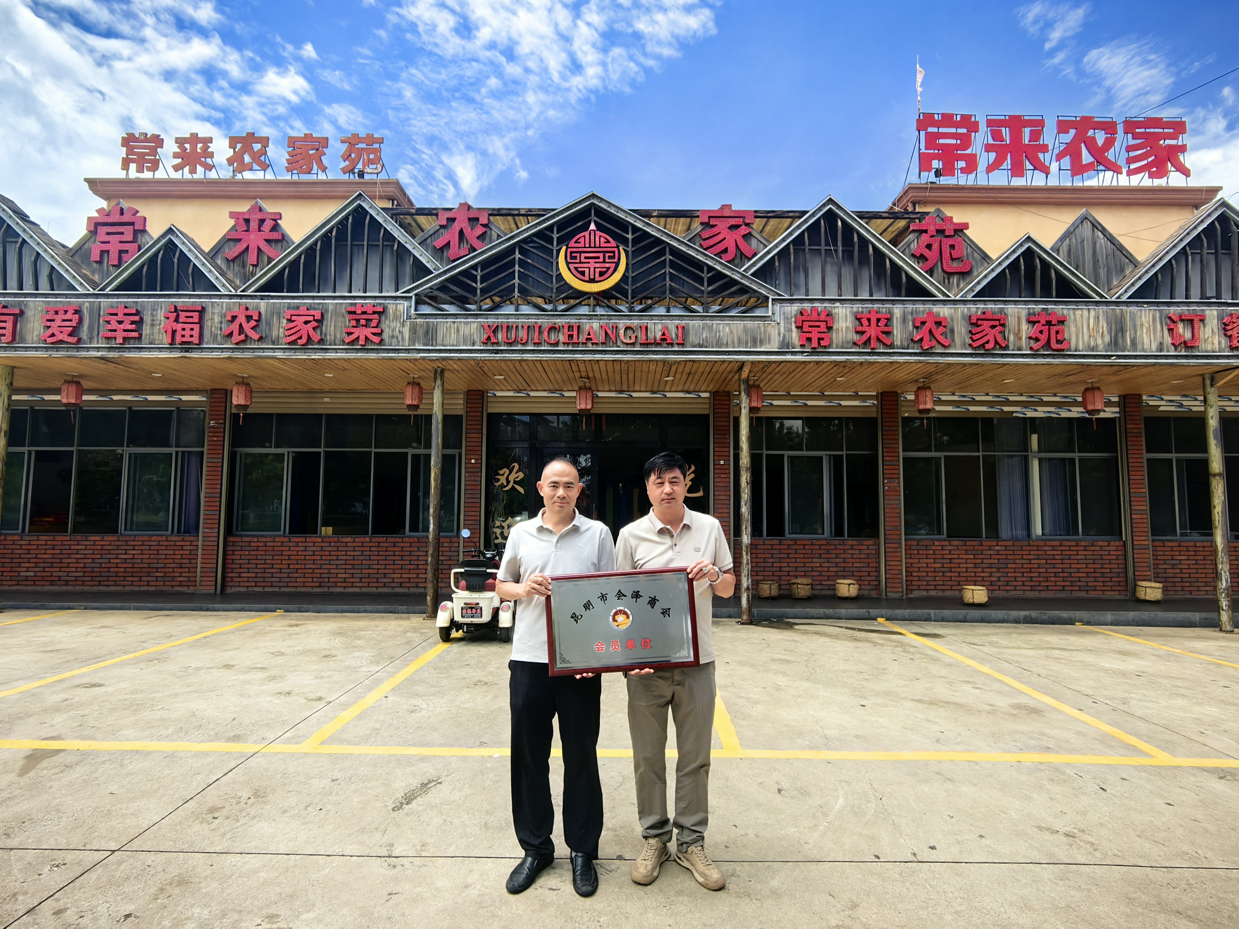 商会轮值领导副会长唐朝稳向会员单位授牌 公司主营业务:餐饮服务。 联系人:许绍能 13529337881 地址:昆明市嵩明县杨林镇龙保居委会官军公路边。