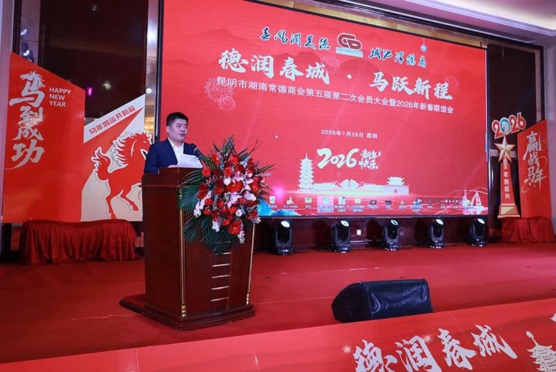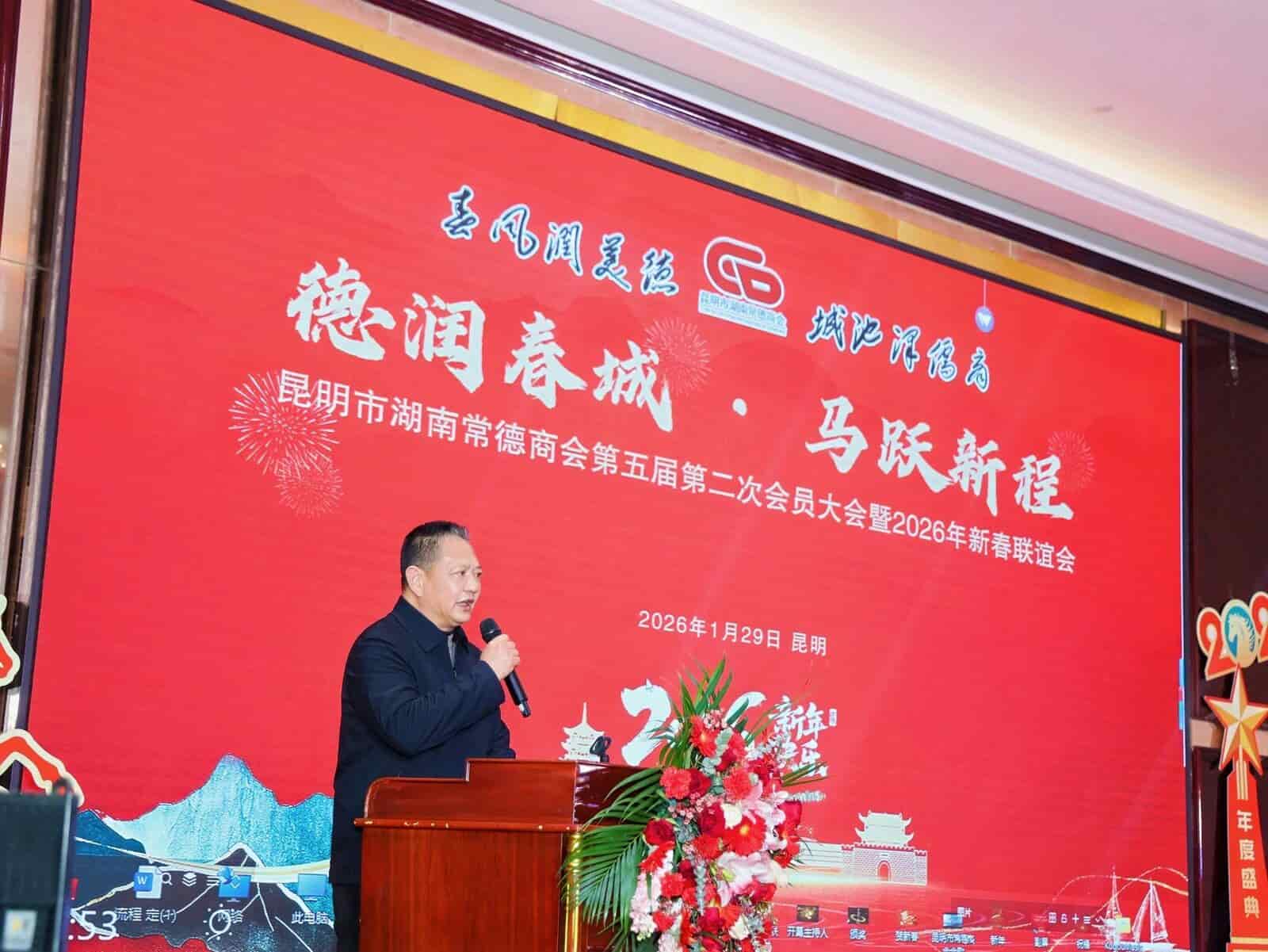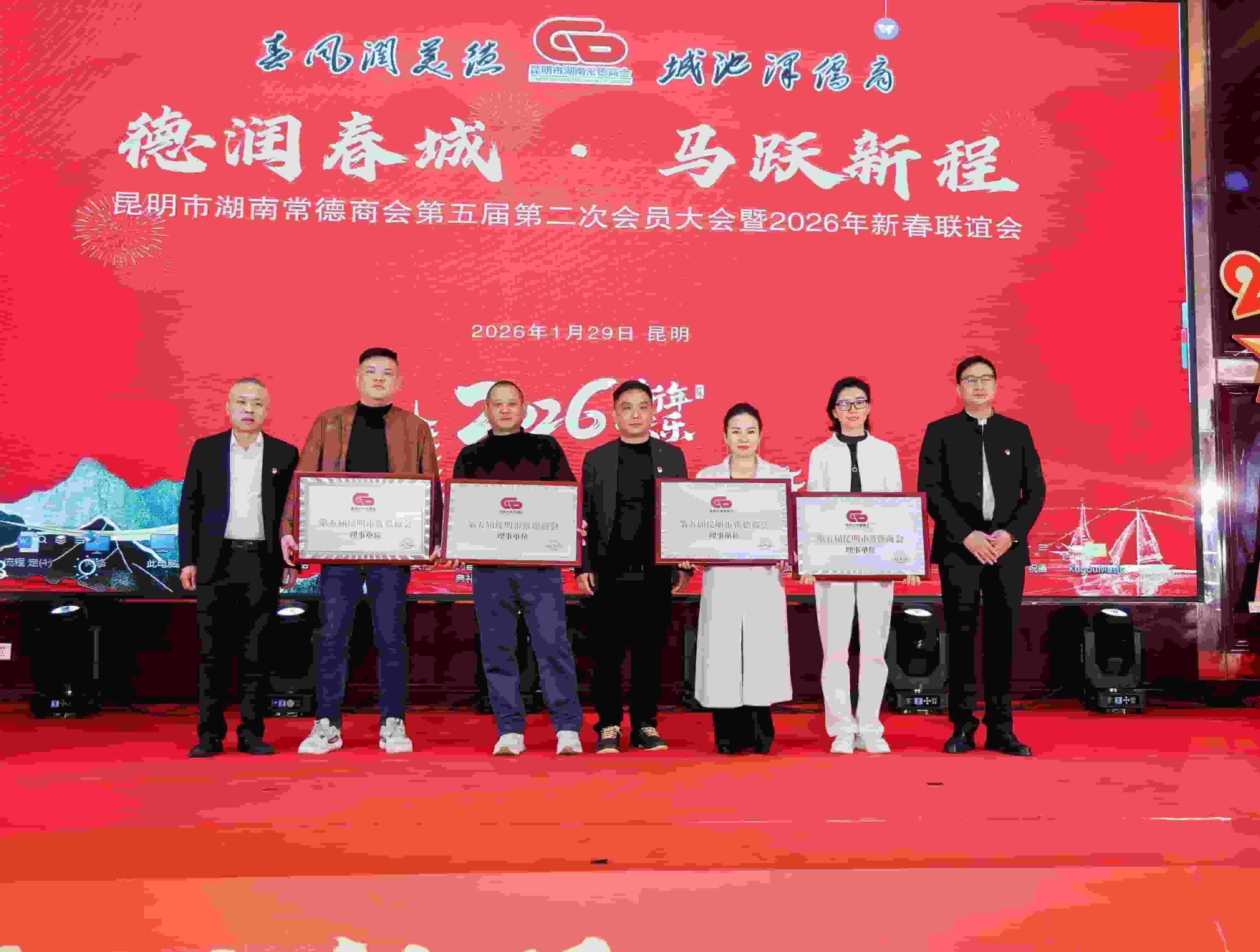 1月29日,昆明市湖南常德商会第五届二次会员大会暨2026年新春联谊会在昆明悦城国际酒店玫瑰厅举行。本次会议以“德润春城 马跃新程”为主题,旨在全面回顾总结商会2025年度工作,表彰先进典型,共叙乡情友谊,喜迎新春。