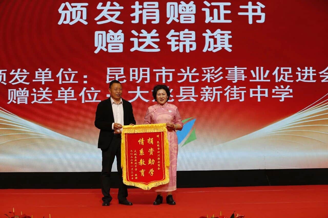 昆明市雅安商会自成立以来,公益前行的脚步从未停止。2025年公益捐赠25.8万元,其中5.6万元现金,通过昆明市光彩事业促进会定向捐赠给大姚新街中学。为了表达对商会的鼓励与感谢,王志敏书记亲自为徐世芬会长捐发了捐赠证书,新街镇中学校长为商会赠送锦旗。