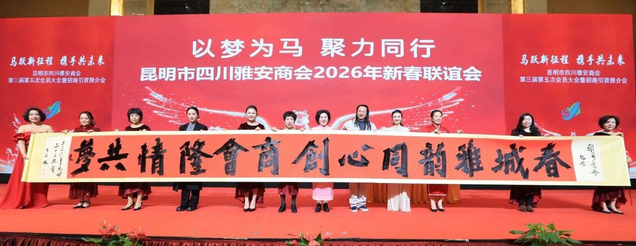 2026年1月30日,昆明市四川雅安商会第三届第五次会员大会暨招商引资推介会在昆明世纪金源大饭店隆重召开。云南省工商联党组成员,省委统战部非公经济处处长喻科,昆明市委统战部副部长、市工商联党组书记王志敏,雅安市相关领导,云南省各州市驻昆办主要负责人,昆明市会泽商会、昆明市内江商会等友好商协会负责人以及昆明市雅安商会全体会员400余人参加了会议。昆明市会泽商会党支部书记、会长孙先强,秘书长马鹏代表商会到会祝贺。