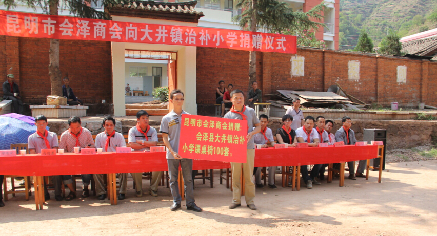 商会情系家乡孩子,爱洒贫困山区 ——会泽县大井镇治补小学献爱心 2014年5月20日,在商会监事会副主席胡向波的带队下,副会长吴云柏、朱智娥、理事余芳、曹锐、办公室罗兴志、代蓉等一行10余人,在县团委副书记唐开虎的陪同下,前往云南省会泽县大井镇治补小学,为这个位于云南省东北部贫困山区的小学校送来100套全新的课桌椅,学校地处牛栏江旁,两旁都是高山峡谷。相对全国整体水平来说,学校所在的山村经济条件落后。会长王顺祥及从当地走出的企业老总胡向波(商会监事会副主席)和部分商会领导得知大井镇最近发生的一次暴雨泥石流,当即组织义务捐资为同学们提前送上“六一”儿童节礼物。