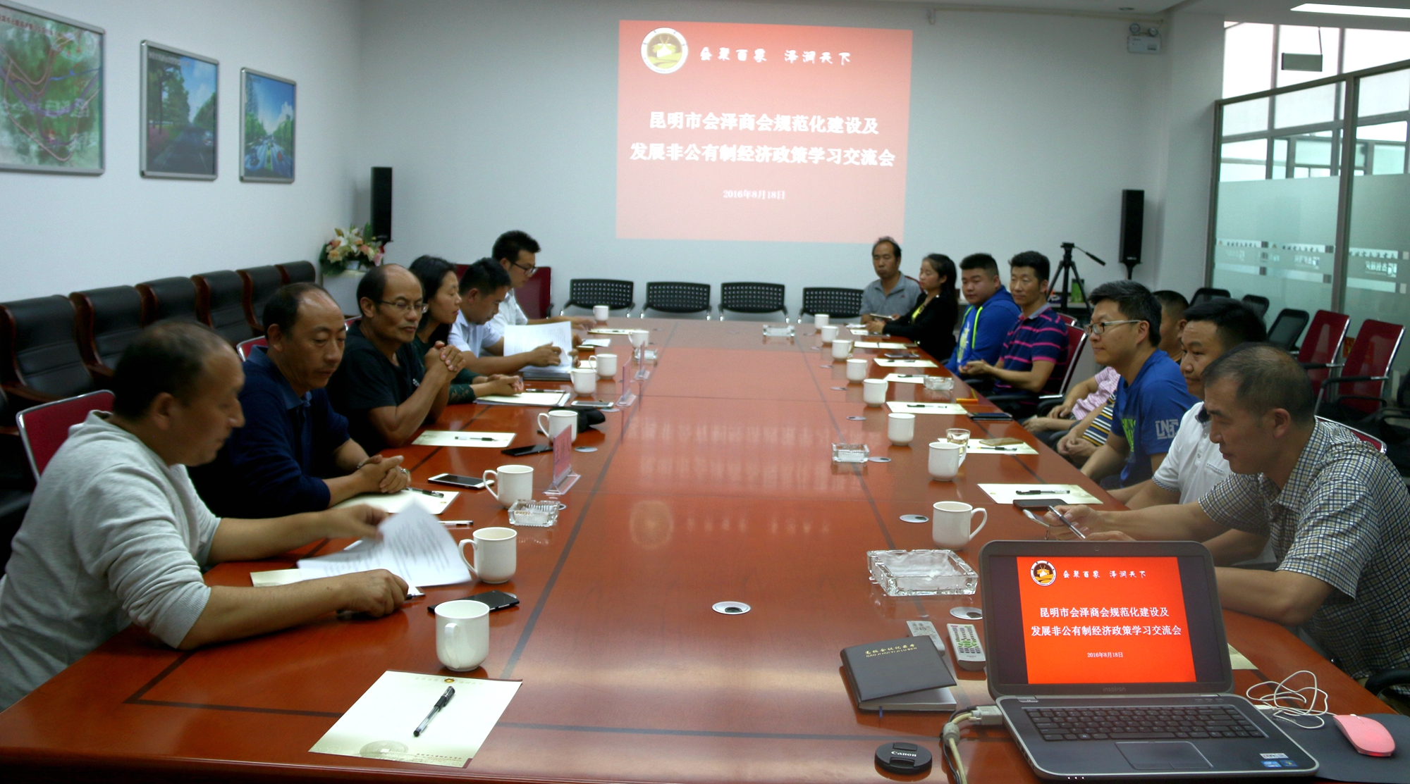 8月18日下午,昆明市会泽商会在商会会议室召开了“加强商会规范化建设及发展非公有制经济政策学习交流会”。昆明市民政局、昆明市工商联领导对加强商会规范化建设及发展非公有制经济政策作了专题讲解。