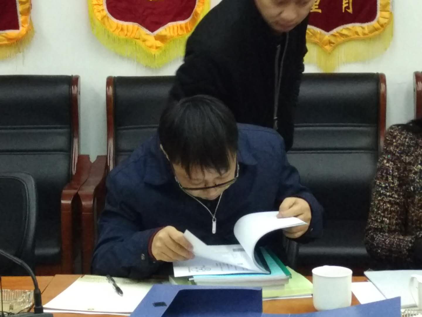 专家仔细查阅相关材料 商会秘书长马鹏代表商会从商会成立的背景、加强制 度建设、强化内部管理、商会发展的思路与实践、党 建强会以及对评估工作的几点说明等五项作专题和视频 汇报。
