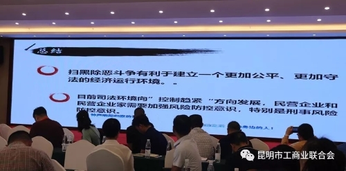 会议邀请市公安局经侦支队、市司法局法律援助中心相关负责人作商会防范非法集资和参与扫黑除恶专项斗争工作的主题宣讲。